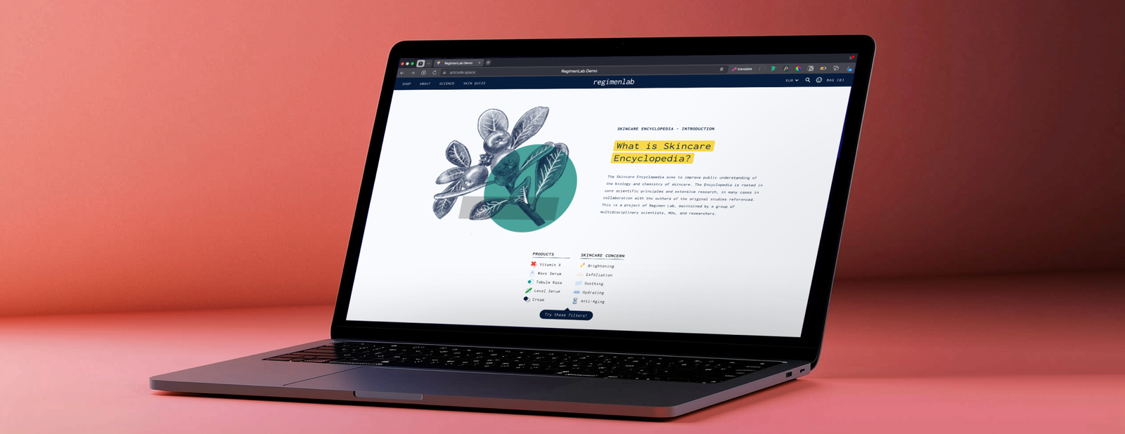 Extrait d'une des pages et de fonctionnalités interactives que j'ai créé pour le site e-commerce la marque (réelle) © Regimen Lab - regimenlab.com, en utilisant Liquid, le langage de programmation de Shopify. Cette démo a été recréée et avec l'autorisation de la marque.